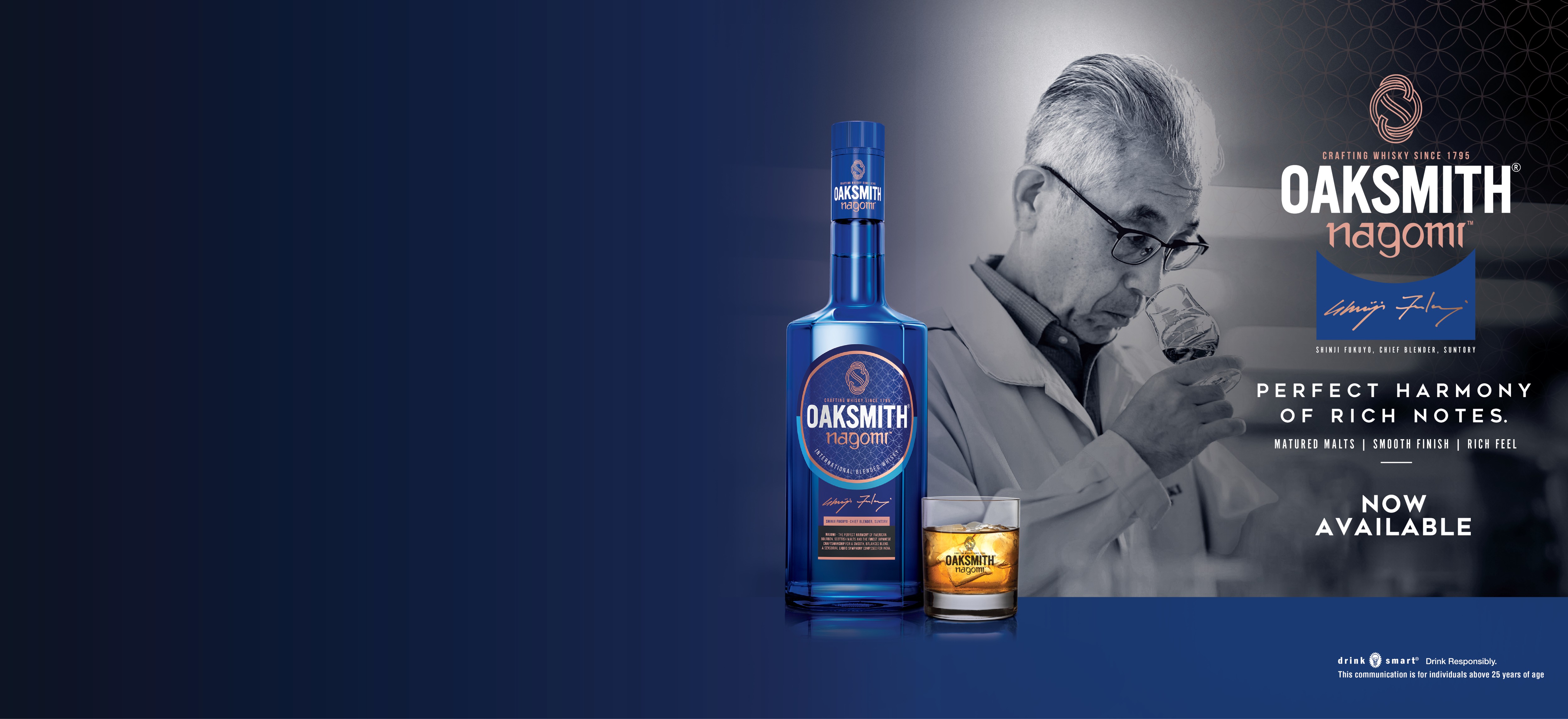 Oaksmith® Nagomi is a sensorial celebration meticulously crafted for the Indian palate. From its intense rich gold appearance to smoky, spicy, and fruity aromas, it offers a full- bodied experience with woody undertones from oak casks, finishing bright, smooth, and surprisingly long. Inspired by Japanese aesthetics, the bottle design reflects strength, simplicity, and timeless elegance, resonating with modern Indian consumers who value authenticity and character.
